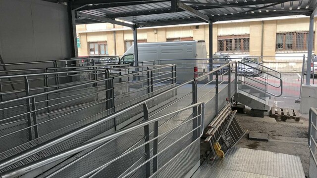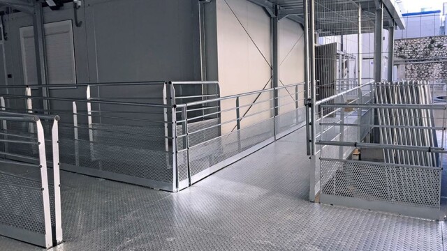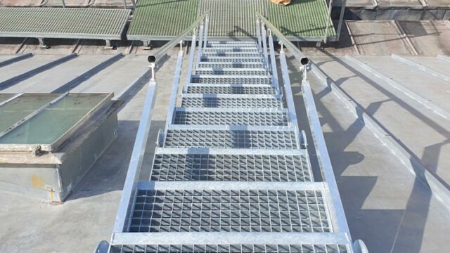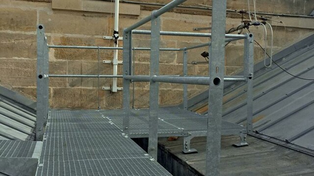 Pour se faire, ACBI a effectuée la pose de 2 cheminements d’accès avec marche en caillebotis + interface de platine avec berceau de récupération de pente. Les mains courantes sont amovibles (se rabattes dans le sens de la pente) pour respecter la norme bâtiment de France. Une butée came permet de sécuriser la main courante relevée une fois déployée. 2 plateformes sur-mesure en caillebotis ont été également fabriquées et posées sur site.