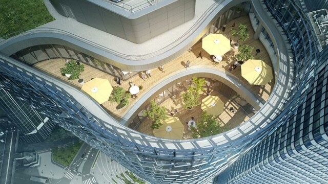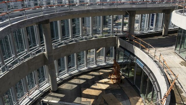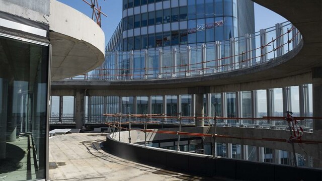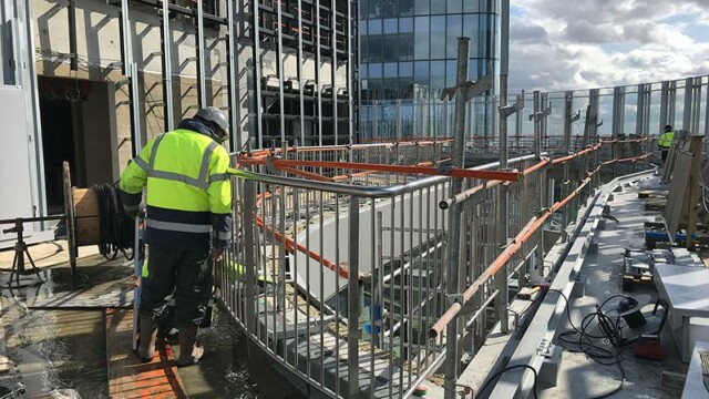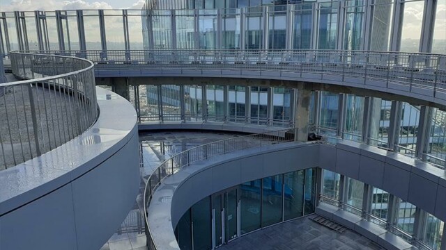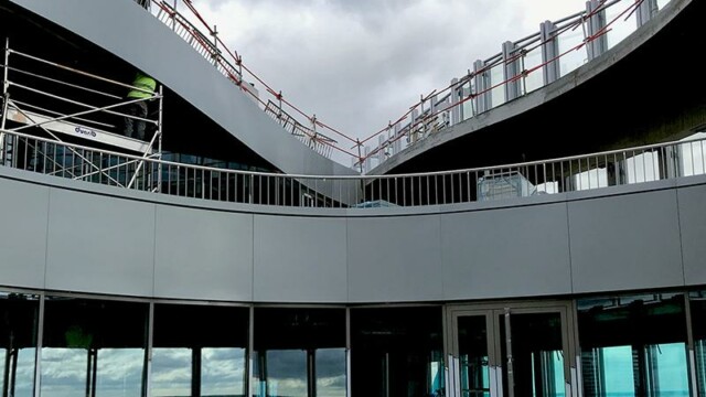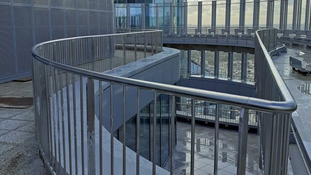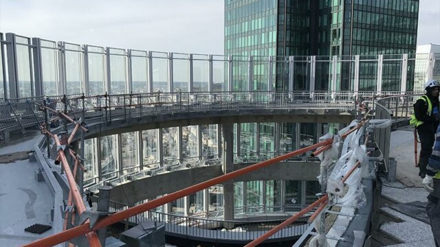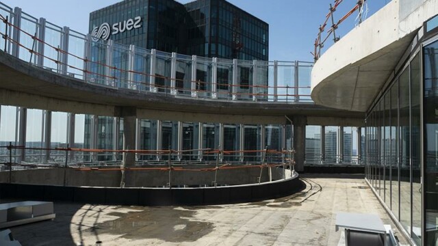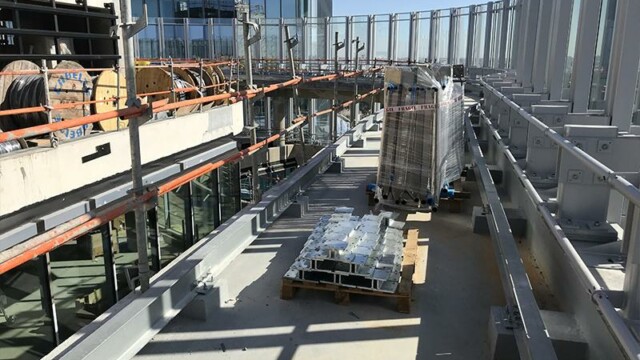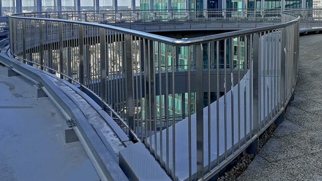 Bienvenu à 150 m d’altitude. Situé en plein cœur de la Défense la tour Alto offre une vue imprenable sur Paris et son quartier d’affaires. Mais ce chantier n’est pas seulement beau, il est aussi particulièrement technique. En effet la terrasse intérieure en forme de haricot ne permettait pas une installation « simple ». Deux platines ont été crées pour cela, et donc deux longueurs de poteaux différentes. D’un côté nous devions nous fixer à la dalle avec une platine verticale pour éviter le chemin de la nacelle (montée sur rail). De l’autre, pour respecter les normes environnementales BBC, la contrainte architecturale préconisait l’installation d’une platine déportée traversant l’isolation. NB: Le cintrage a été réalisé en usine pour une pose réglée au millimètre près.
