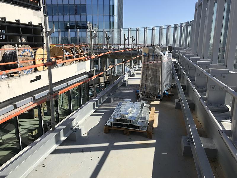 Bienvenu à 150 m d’altitude. Situé en plein cœur de la Défense la tour Alto offre une vue imprenable sur Paris et son quartier d’affaires. Mais ce chantier n’est pas seulement beau, il est aussi particulièrement technique. En effet la terrasse intérieure en forme de haricot ne permettait pas une installation « simple ». Deux platines ont été crées pour cela, et donc deux longueurs de poteaux différentes. D’un côté nous devions nous fixer à la dalle avec une platine verticale pour éviter le chemin de la nacelle (montée sur rail). De l’autre, pour respecter les normes environnementales BBC, la contrainte architecturale préconisait l’installation d’une platine déportée traversant l’isolation. NB: Le cintrage a été réalisé en usine pour une pose réglée au millimètre près.